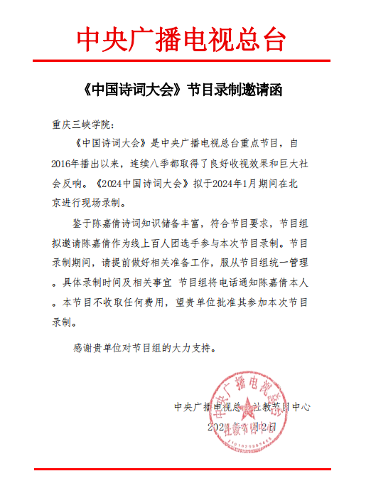 近日,太阳成集团传来喜讯,2021级汉语言文学(师范)4班的陈嘉倩同学成功入选《2024中国诗词大会》线上百人团。“中国诗词大会”是一档由中央广播电视总台原创的大型文化节目,节目以“赏诗词之美、寻文化之根、铸民族之魂”为理念,唤起人民群众对传统诗词文化的浓厚兴趣,在全国范围内掀起了广大诗词爱好者学习的热潮。