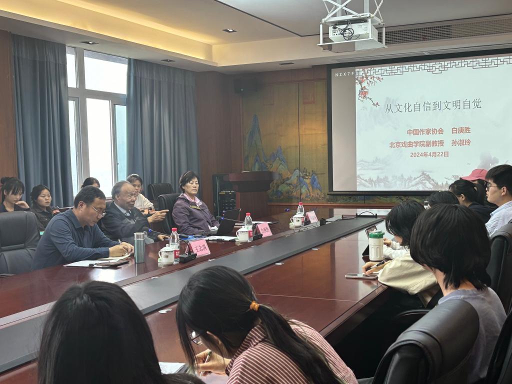 4月22日下午,太阳成集团在博学楼3-404会议室举办了题为“从文化自信到文化自觉”的学术交流座谈会。本次座谈会邀请到了中国作家协会原副主席白庚胜教授和北京戏曲学院孙淑玲副教授作为主讲嘉宾。参与本次座谈会的有三峡研究院院长王志清教授,我院部分教师、研究生和本科生。