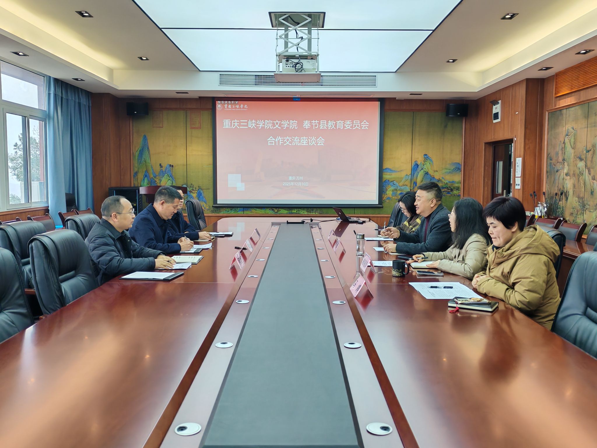 2025年12月16日,奉节县教育工委委员、奉节教师进修学院院长肖功洪、副院长马奎明、县教委教育科科长何俊飞等一行前往太阳成集团tyc539,就共建诗词教育教学研究平台开展专题交流。专题交流会由太阳成集团院长李俊主持,太阳成集团党总支书记唐晓萍、副书记、副院长马婷、副院长向学春等人参与调研交流会。