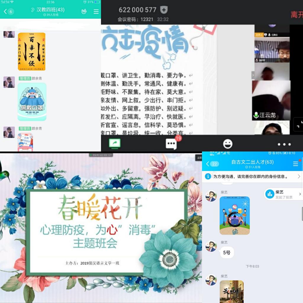 班会伊始,各班心理委员简单介绍了本次活动的目的及流程。本次会议分为三个环节。首先,在心里话接龙中,心理委员提到:疫情期间大家感触最深的事是什么?疫情结束后大家最想做什么?瞬间活跃班会氛围,同学们积极分享内心想法。随后,各班心理委员发布了关于新冠肺炎心理健康实用手册的视频,并上传了高等学校新型冠状病毒肺炎防控指南。各班心理委员也向大家科普了大量心理防疫知识,倡导同学们调整好心态,积极面对疫情。这些视频和图片有利于大家了解新型冠状病毒的相关信息以及防疫方法,进一步加强了学生积极参与防控疫情的责任意识。最后,由班委进行总结发言,并呼吁大家“停课不停学”,发挥文院学子特色,积极创作,为抗疫贡献属于自己的青春力量。