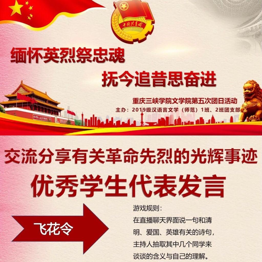 本次活动在合唱团歌中拉开序幕,活动共分为四个环节,在分享环节中,大家分享了革命先烈的光辉事迹及当代90、00后感人事迹,彼此在交流中深有感触,并表明要坚定信念,传承时代精神。随后的视频学习环节播放了一系列先烈抗战视频,观看结束后学生积极发表感想,身为中华儿女应感恩英雄,也应坚定志向,应学习先烈的大无畏精神,在国家需要我们的时候挺身而出。在游戏环节里,大家围绕“清明节”“英雄”“爱国”三个话题进行飞花令,现场气氛活跃,学生对何谓英雄、何谓爱国的理解也更加深刻。最后,优秀团员代表廖川及团支书代表刘博文进行总结发言,他们提到,在我们深切缅怀革命烈士的同时,更应该继承红色基因,弘扬革命精神,身为团员更应以革命先烈为榜样,向他们看齐,积极向上、发奋进取。