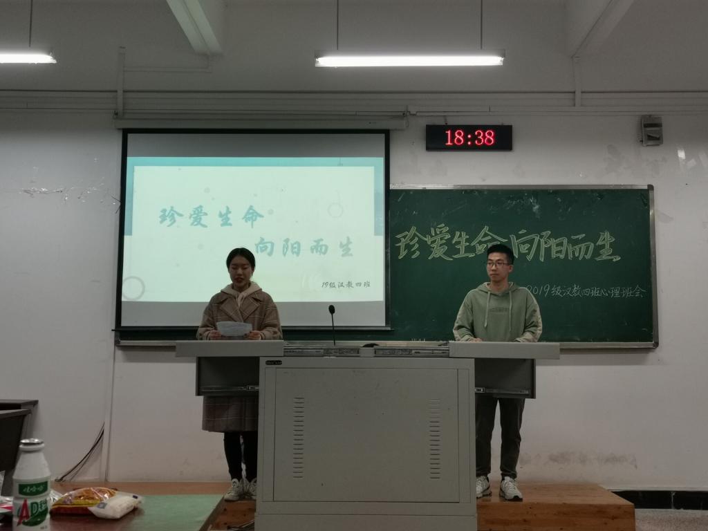 为增强大学生珍爱生命的意识,引导同学们健康积极地生活,我院团总支心理健康教育工作部兼学生权益维护部组织2019级汉教三、四班于11月6日分别于明辨楼1栋306、307室开展“珍爱生命,向阳而生”主题班会。
