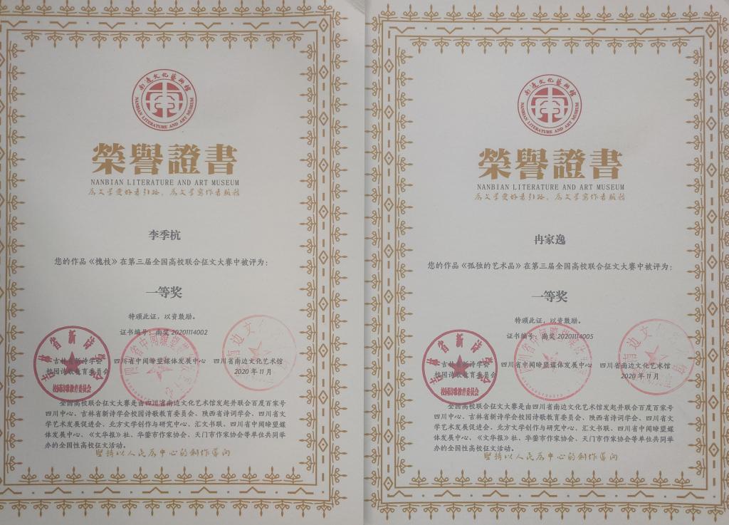11月19日大赛结果公布,我院学子冉家逸、李季杭2人获一等奖,包敏等5人获二等奖,李黎等9人获三等奖,孙晴等人获优秀奖。同时,大赛组委会授予三峡文学社“优秀文学工作集体”称号,授予郑雯瑾、刘俊希、刘治鑫、陈春洁4人“优秀文学工作者”荣誉称号。