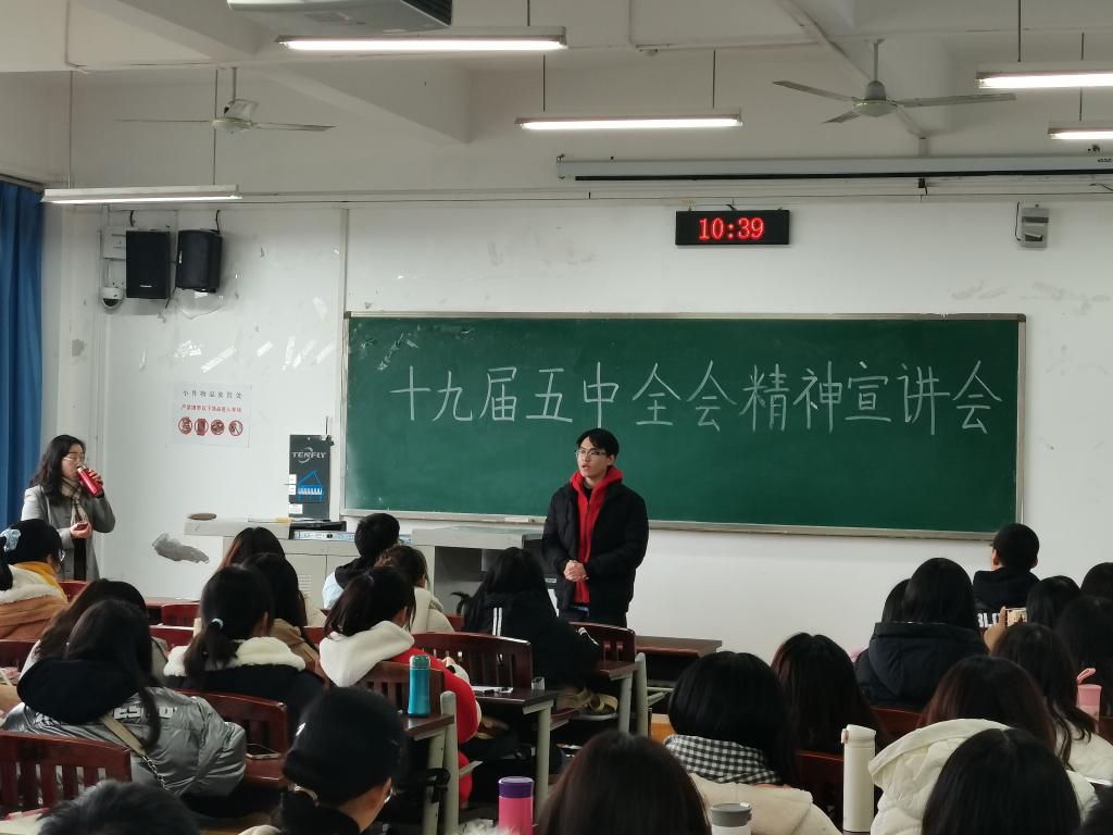 为深入贯彻落实党的十九届五中全会精神,12月3日上午,我院在明辨楼1栋403室举行了十九届五中全会宣讲活动,2020级汉语言文学(师范)1班和2班全体同学参与会议。宣讲会由太阳成集团党总支书记唐晓萍主讲,2020级汉语言文学(师范)1班班长陈庭立主持。