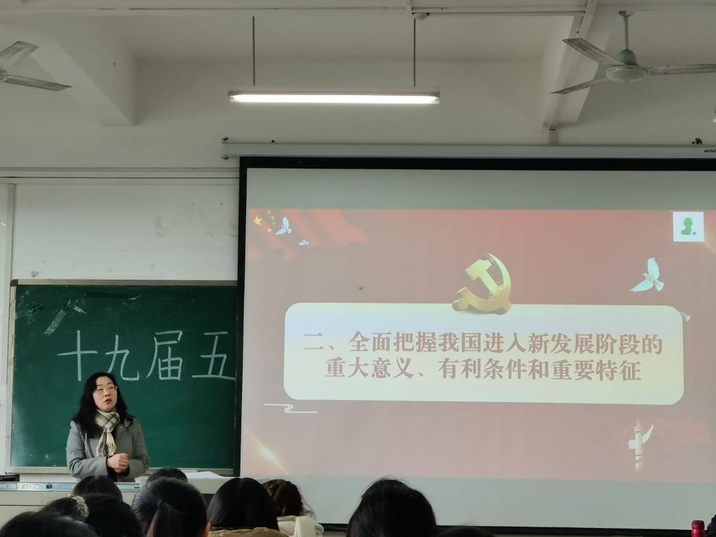 首先,唐晓萍提到,2020年是极不平常的一年,它是十三五的收官,十四五的开启之年,代表我们已经迎来了新的视野,新的规划,要重视对自己未来的展望,做好新规划,开启自己作为大学生新的长远计划。接着,她从四个方面讲述十九届五中精神,分别是全面把握我国进入新发展阶段的重大意义,有利条件和重要特征;全面把握新发展阶段的目标任务;全面构建新发展格局的战略构建和重要着力点;坚持党的全面领导,动员各方面力量,为实现“十四五”规划和2035年远景目标而团结奋斗。会议中,唐晓萍用自身助力脱贫攻坚的故事,意在告诉同学们,在2020年之后特殊的国际形势与国内大环境之下,要保持充足的战略定力,冷静沉着,要富有创新思维,贯彻创新思维,文化长新。必须坚持党的领导,做到“五点必要”“六点要点”,结合国内外大环境,真脱贫,脱真贫。开启我们新征程,把我们中华民族文化复兴作为极为重要的使命,实现中华民族伟大复兴!随后,唐晓萍宣讲了市委五届九次全会精神,充分肯定我市决胜全面建成小康社会取得的相关性成就。