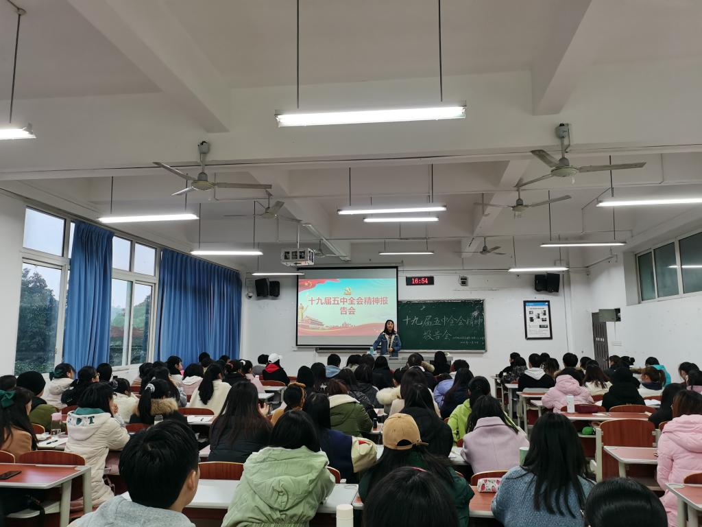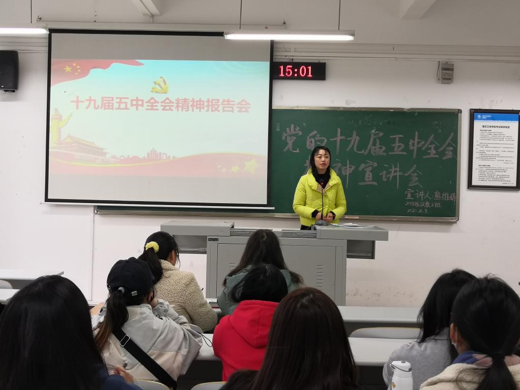 为学习贯彻党的十九届五中全会的精神实质和丰富内涵,太阳成集团学工办主任兼团总支书记熊维娟于12月4日和8日分别为2018级汉语言文学(师范)2、3、4班进行了十九届五中全会宣讲报告,会议分别由陈源和谢佳芯主持。