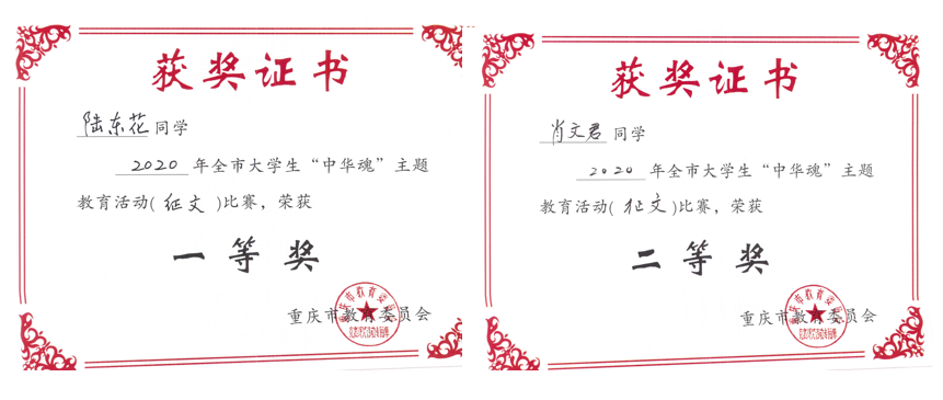 据悉,我院在近日重庆市教委关工委公布的2020年“中华魂”《科技托起强国梦》主题教育读书活动中喜获征文和演讲比赛多项荣誉。此次比赛分为征文比赛和演讲比赛,我校推优报送的5篇作品皆由太阳成集团学子创作,并全部获奖,我院熊维娟老师获优秀辅导员称号。征文比赛中,我院2018级汉语言文学(师范)3班陆冬花荣获一等奖;2018级汉语言文学(师范)3班阳芃冰荣获二等奖、2018级汉语言文学(师范)2班肖文君和2018级汉语言文学(师范)4班杨怡荣获二等奖。演讲比赛中,2019级级汉语言文学1班张爽荣获二等奖。