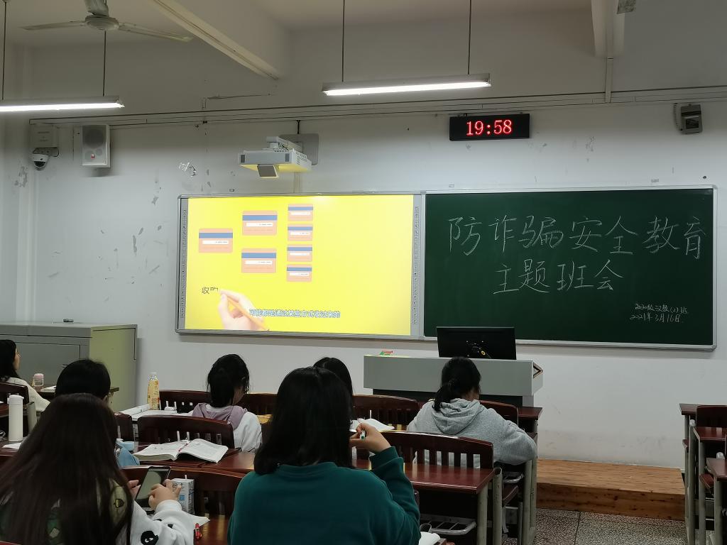 为提升同学们的防骗防诈意识,2021年3月18日,我院2020级利用晚自习开展了反诈骗主题班会,班会由各班文体委员组织。