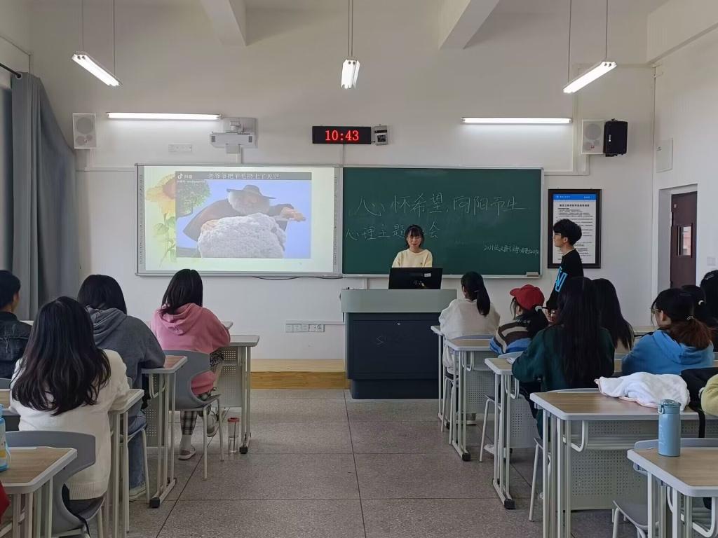 为全面贯彻党的教育方针,推进素质教育,提高学生心理调节能力,培养良好心理品质,促进学生思想道德素质和心理健康成长,2022年10月9日至10月14日,我院团总支学生会心理健康教育工作部兼学生权益维护部组织2021级全体学生在博学楼教室开展了“心怀希望,向阳而生”主题班会。班会由各班心理委员主持。