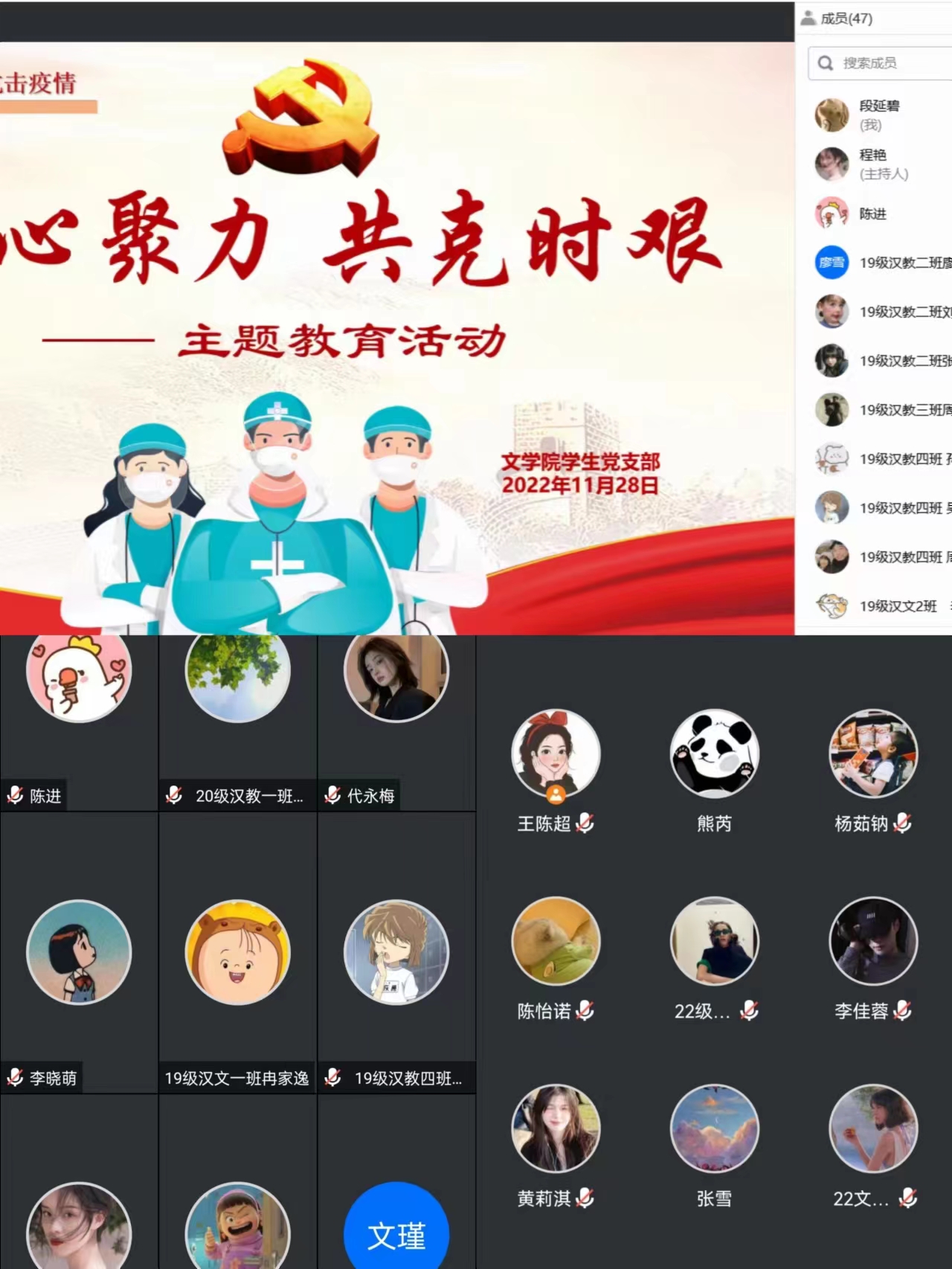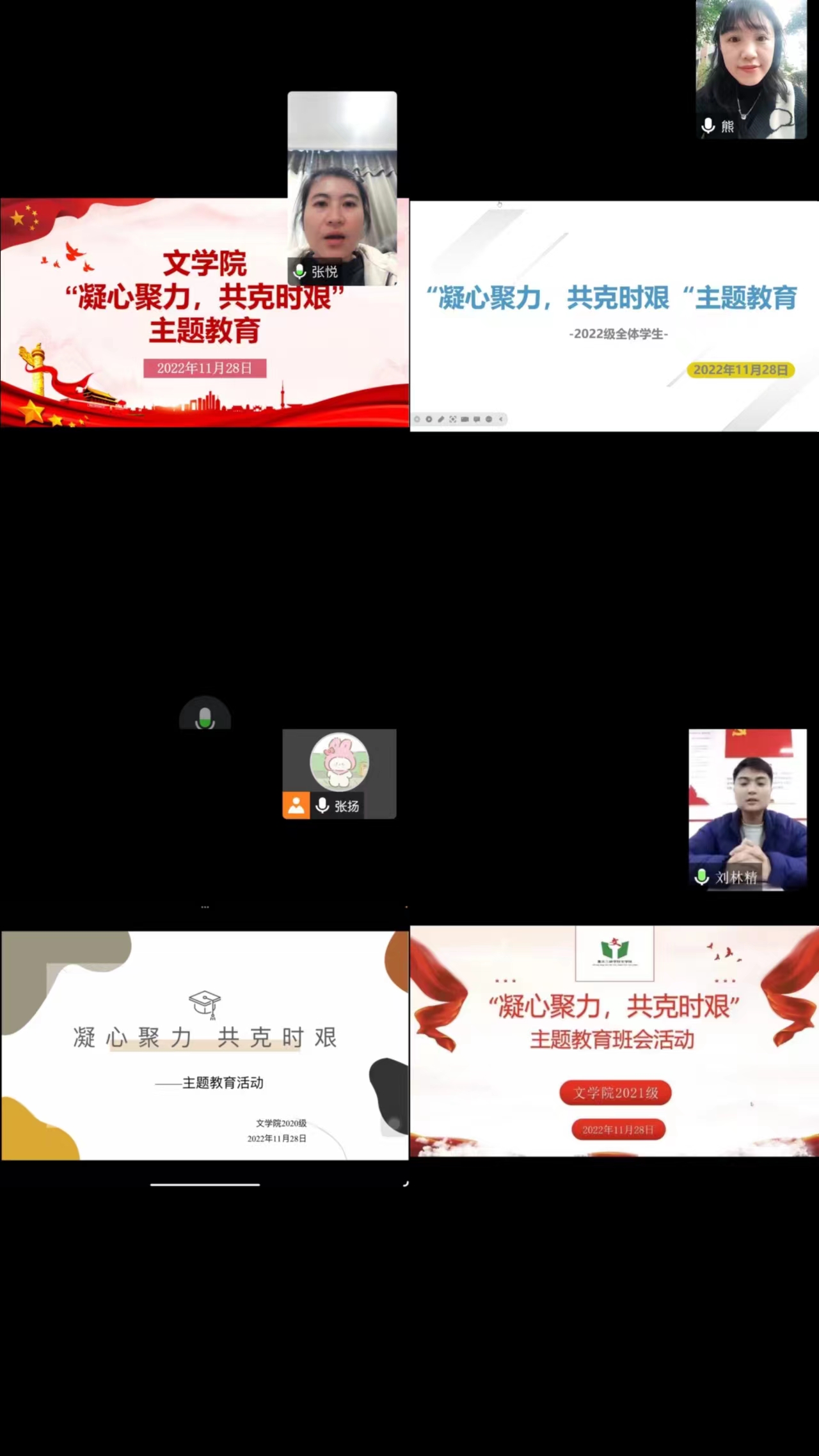 为贯彻落实学校疫情防控工作调度会精神,也为增强学院全体学生打赢疫情防控歼灭战的信心,更好地适应线上教学的生活。11月28日下午,我院各年级开展了“凝心聚力,攻克时艰”线上主题教育活动。