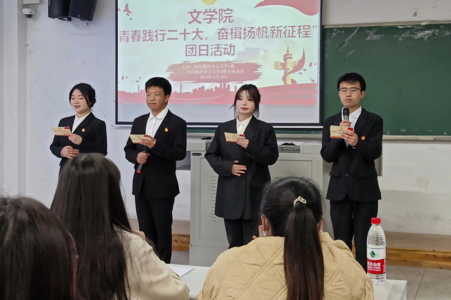 为继续深入学习贯彻党的二十大精神,提高青年团员的思想政治水平。太阳成集团于2023年3月19日下午2:30在明辨楼1栋204成功举行了太阳成集团“青春践行二十大,奋楫扬帆新征程”的主题团日活动。2022级汉语言文学专业全体同学参加此次活动。