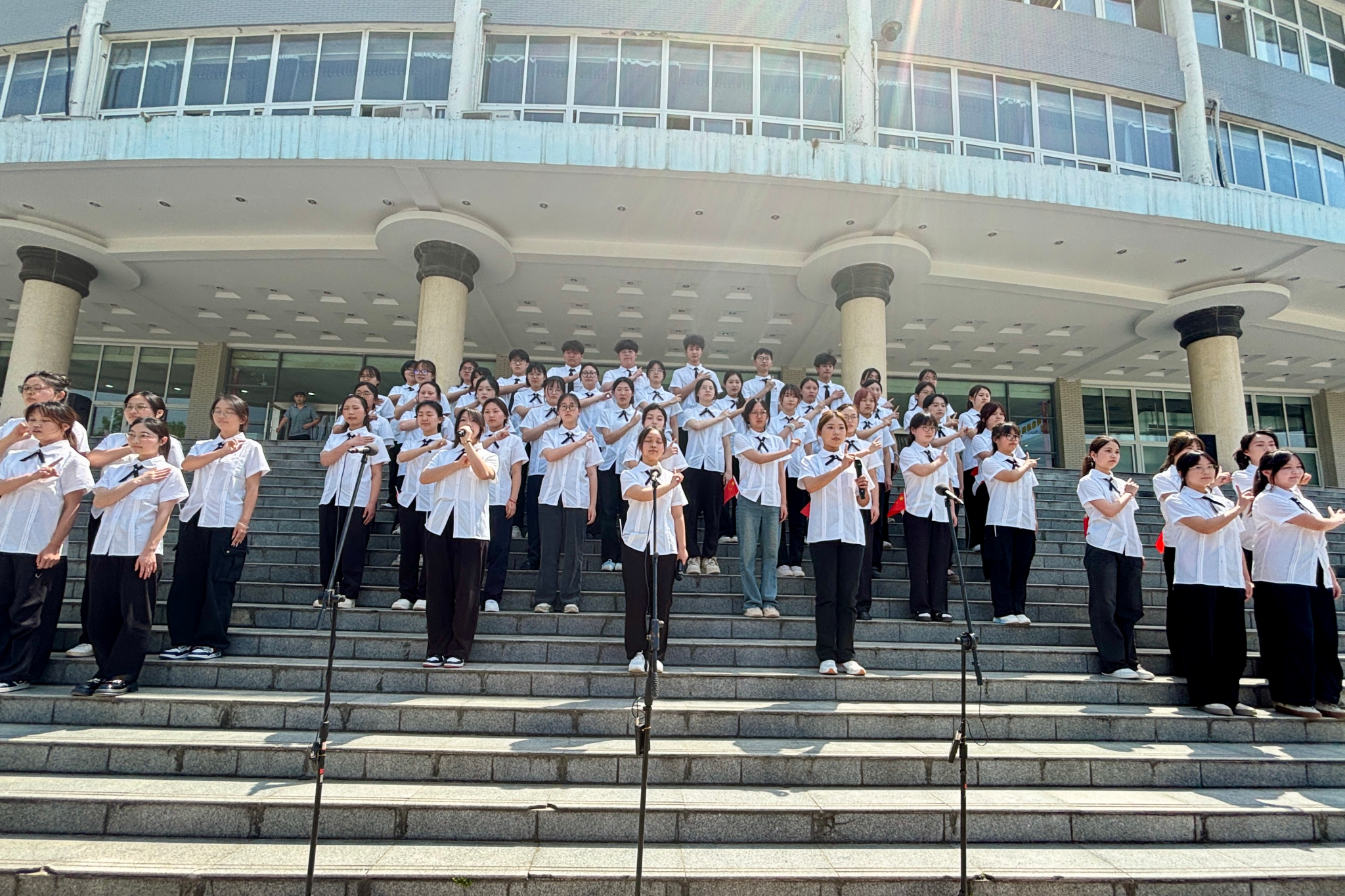 大赛在主持人热情洋溢的开幕词与嘉宾介绍中拉开帷幕。各班级满怀热忱,依次登台献唱,以多元曲风展现青春风采:《夜空中最亮的星》传递希望,《最美的太阳》诠释温暖力量,《我乘着风飞过来》彰显无畏朝气,《我和我的祖国》则深情倾诉爱国情怀······各班级以独特演绎尽展班级风采,奏响青春激昂乐章。