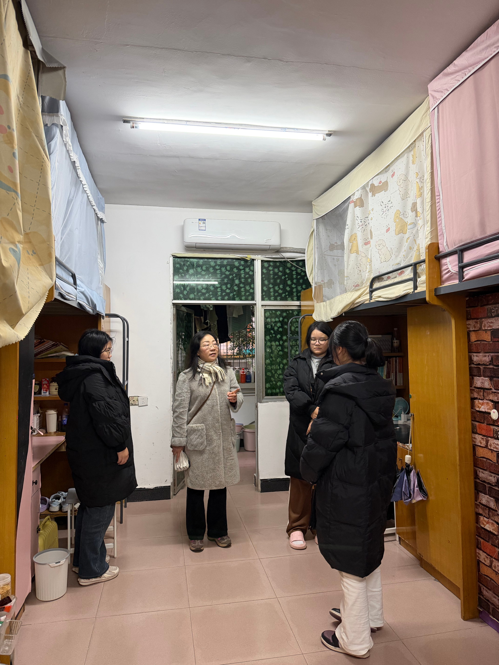 走访过程中,唐晓萍重点检查了宿舍的用电安全与卫生情况,叮嘱同学们要提高安全意识,杜绝使用违规电器,共同维护良好的宿舍环境。同时,唐晓萍还详细了解了同学们的学习进度,鼓励大家合理安排时间,认真备考,争取在期末考试中取得优异成绩。