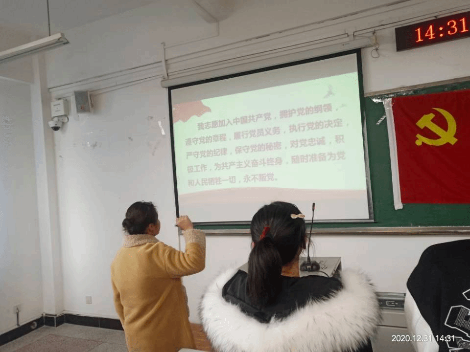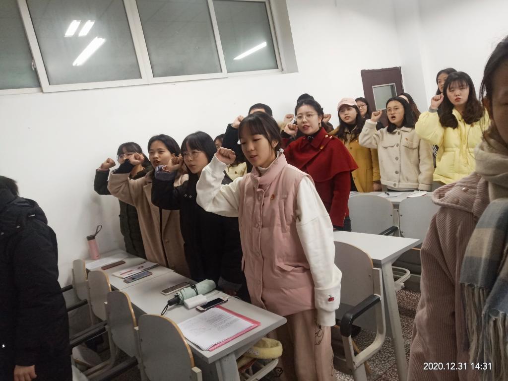 为了更好让预备党员接受党的教育,树立为共产主义奋斗终身的理想信念,2020年12月31日下午,我院在明辨楼1栋311召开了预备党员入党宣誓大会,会议由鲍寒冰同志主持,学生第一党支部书记王陈超、学生第二党支部书记张悦及14名预备党员参与本次会议。