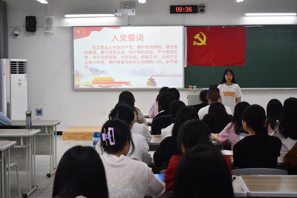 王陈超同志带领24名预备党员面对党旗,进行了入党宣誓。预备党员代表曹梦芸同志表示要终生铭记并践行入党誓词,要从认真遵守党的纪律和各项规章制度等五个方面来体现先锋模范作用。张悦同志对新发展的同志提出了两点要求:第一,在今后要更加严格要求自己,学习与生活都要做好带头作用,要时刻牢记入党誓词,铭记为人民服务的宗旨,做到不忘初心。第二,希望大家继续加强理论学习,提高自己的党性修养,向优秀党员看齐,坚持终身学习。