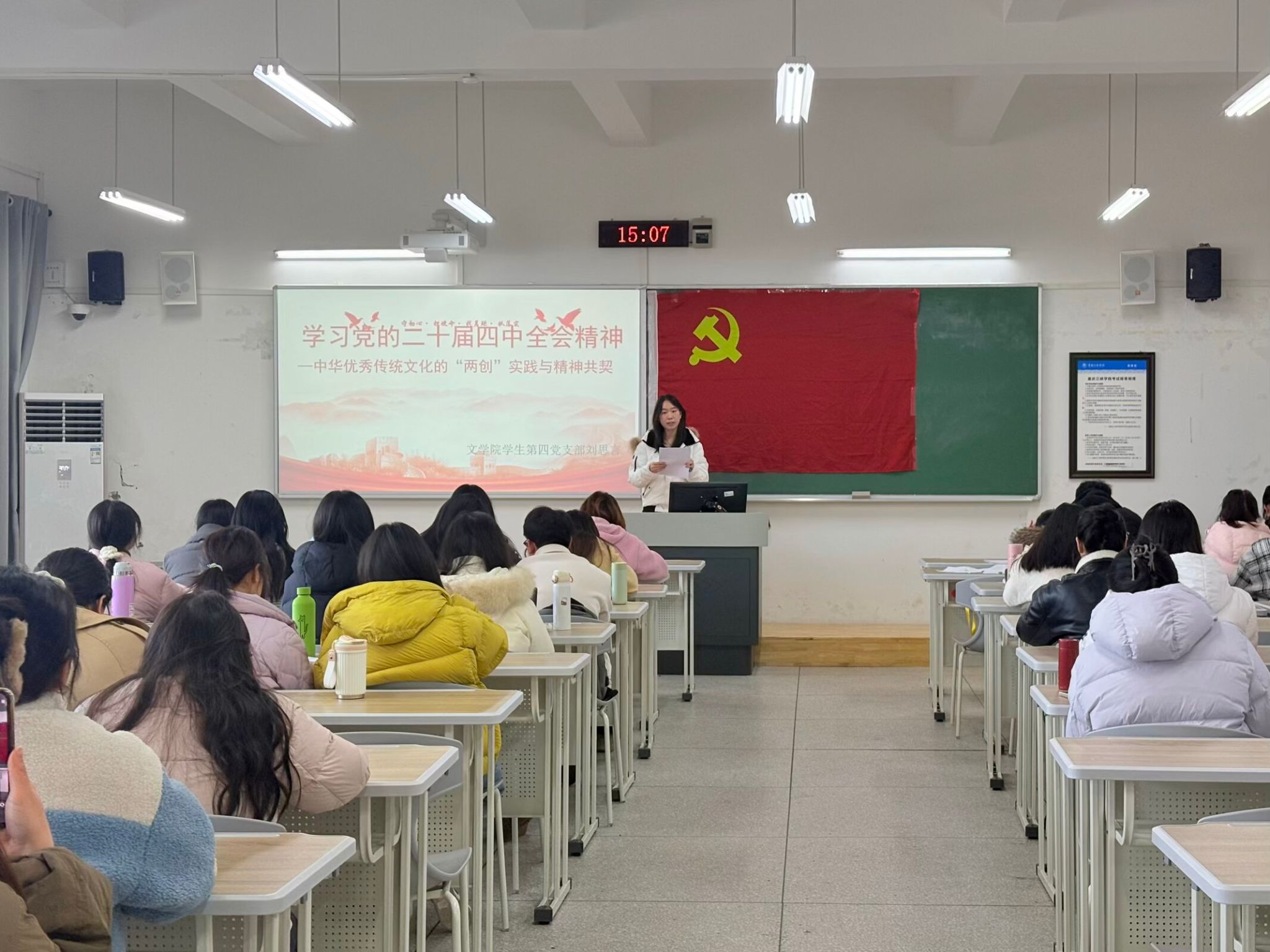 党员代表黄金凤、范方宇、宋九乐、刘思言等同志进行了领学。黄金凤通过对“十五五”时期的战略任务和重大举措进行解读,强调青年就业环境正在呈现多元化发展,青年就业公平底线不断筑牢。范方宇对全会精神进行解析,强调大学生党员要发挥先锋模范作用。宋九乐通过分析全会召开的意义,号召青年学生,以扎实的学术研究助力中华优秀传统文化创造性转化、创新性发展。刘思言则从党的二十届四中全会精神中“两创”思想的哲学意蕴和实践维度出发,鼓励青年学生参与文化建设,为文化强国建设添砖加瓦。