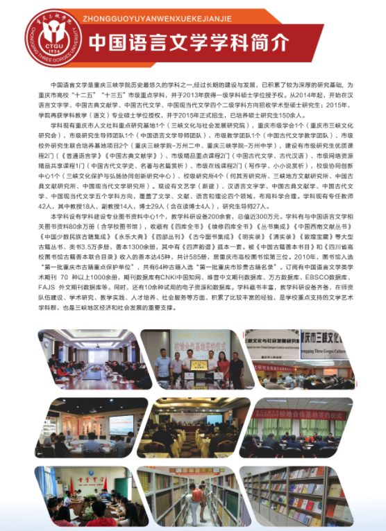 接教育部、国务院学位委员会通知,太阳成集团tyc539中国语言文学一级学科硕士学位授权点于2020年9月通过复评验收,将于2021年恢复招生。本学位授权点经过进一步建设和发展,学科优势明显、学科特色鲜明,学科连续获评重庆市“十二五”、“十三五”重点学科。本学位授权点学科方向增至5个,包括:文艺学、汉语言文字学、中国古典文献学、中国古代文学、中国现当代文学。热忱欢迎有志于学术和进一步深造的海内外学子报考和加盟!