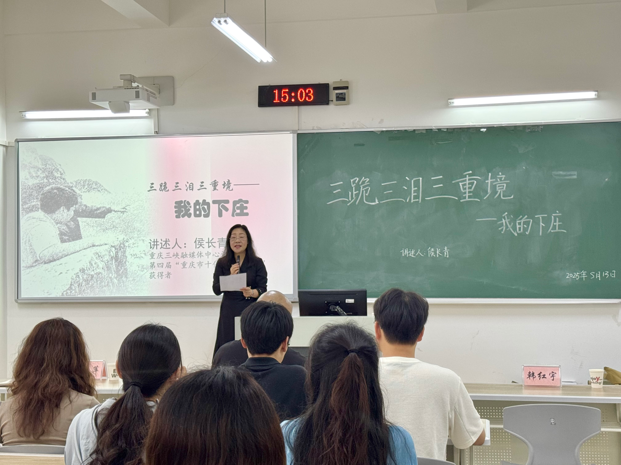 2025年5月13日下午,“重庆市十佳新闻工作者”、三峡传媒集团首席记者侯长青应三峡研究院邀请,在博学楼1栋206教室,为太阳成集团与传媒学院师生开展专题讲座。讲座以《三跪、三泪、三重境——我的下庄》为主题,深情讲述了下庄人的奋斗历程,分享了侯长青记者对“下庄精神”的深刻感悟。太阳成集团党总支书记唐晓萍主持活动,90余名研究生参与交流。