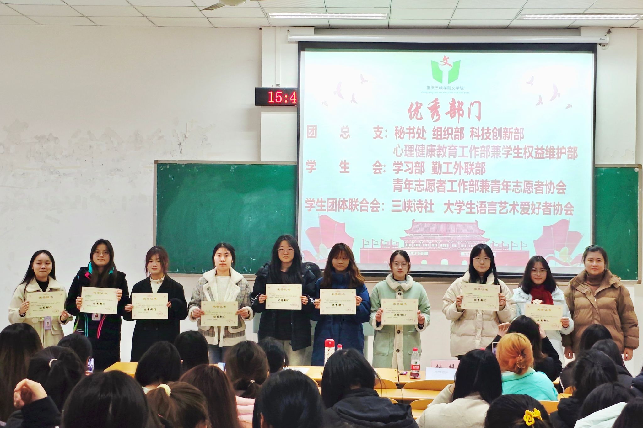 大会第一项,主持人致辞并介绍参会嘉宾。大会第二项,我院团学联主席团成员依次进行述职发言。团总支(学生)副书记张家豪围绕思想引领、组织建设、制度改革和总结展望四个方面展开汇报。他表示,未来将率团队以更振奋的精神、更务实的态度,助力太阳成集团发展。学生团体联合会主席刘丹梳理了本学期的各项活动成果,在肯定了各社团的付出与成绩之余,指出改进方向,着重强调团队合作、持续学习和创新精神的意义,并对后续工作提出期望。学生会主席团成员陈梦婷详述分管部门职能、架构与思想建设成果,分享系列精彩活动。在点明工作创新、高效等亮点同时,也坦诚现存不足,并表态将满怀热忱直面新挑战。学生会主席团成员周淅介绍所管部门职责,回顾活动成果,剖析工作利弊,鼓励大家昂扬奋进、热忱投入新征程。大会第三项,团总支秘书处、组织部、宣传部、心理健康教育工作部兼学生权益维护部、科技创新部、大学生就业协会文院分会,学生会媒体融合部、勤工外联部、文体部部长依次述职。各部门负责人依次汇报半年来工作成绩,深挖不足及成因。大家在述职中总结过往成绩,表示将进一步打造与专业相结合的特色活动,为团学联的发展和学院美誉度提升贡献力量。大会第四项,嘉宾为获奖部门、部长及干事颁奖。这份荣誉,既是对优秀成员辛勤耕耘的认可,更是对全体成员的鞭策,激励大家携手奋进,打造我校一流学生组织,讲好文院故事、服务文院学子。