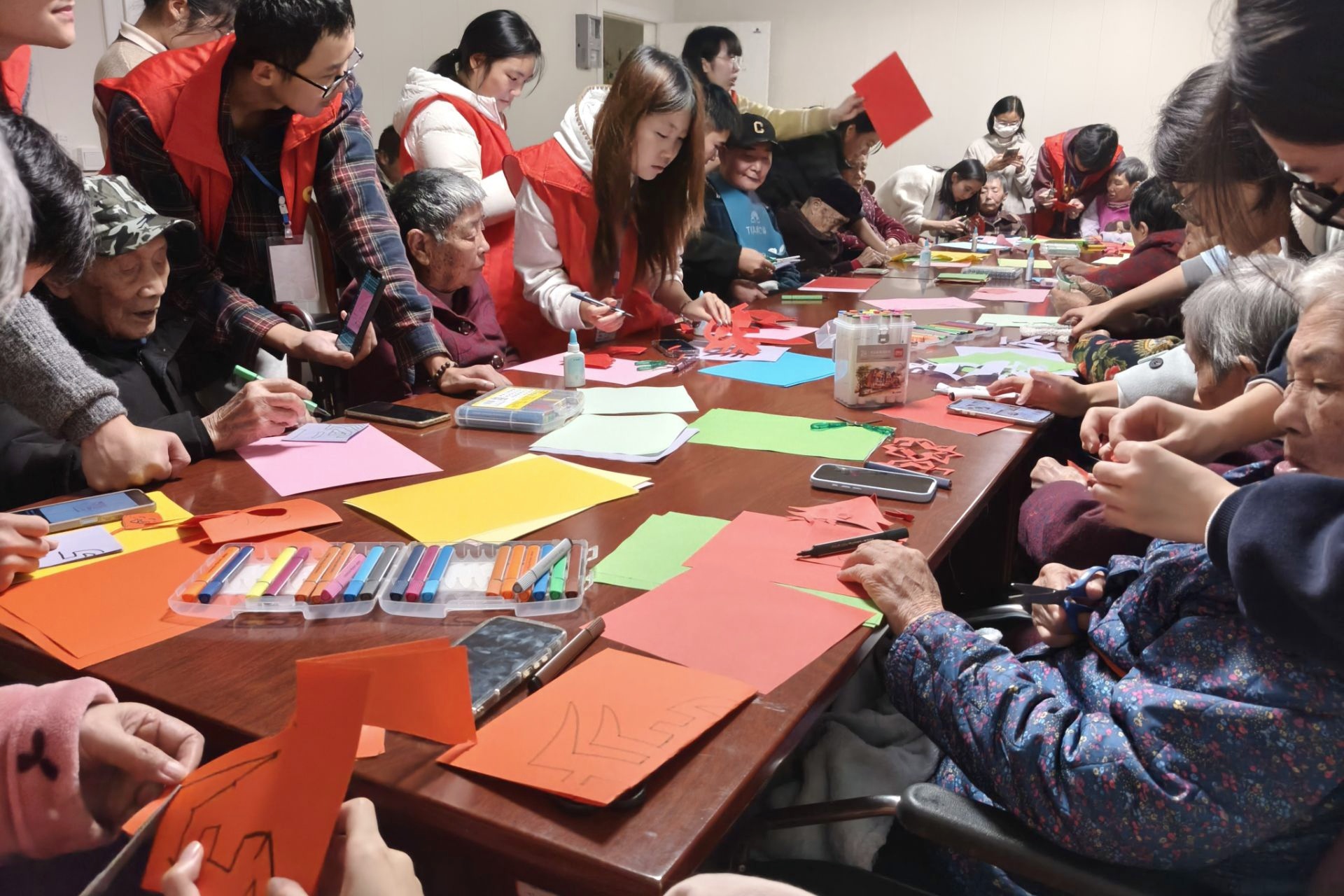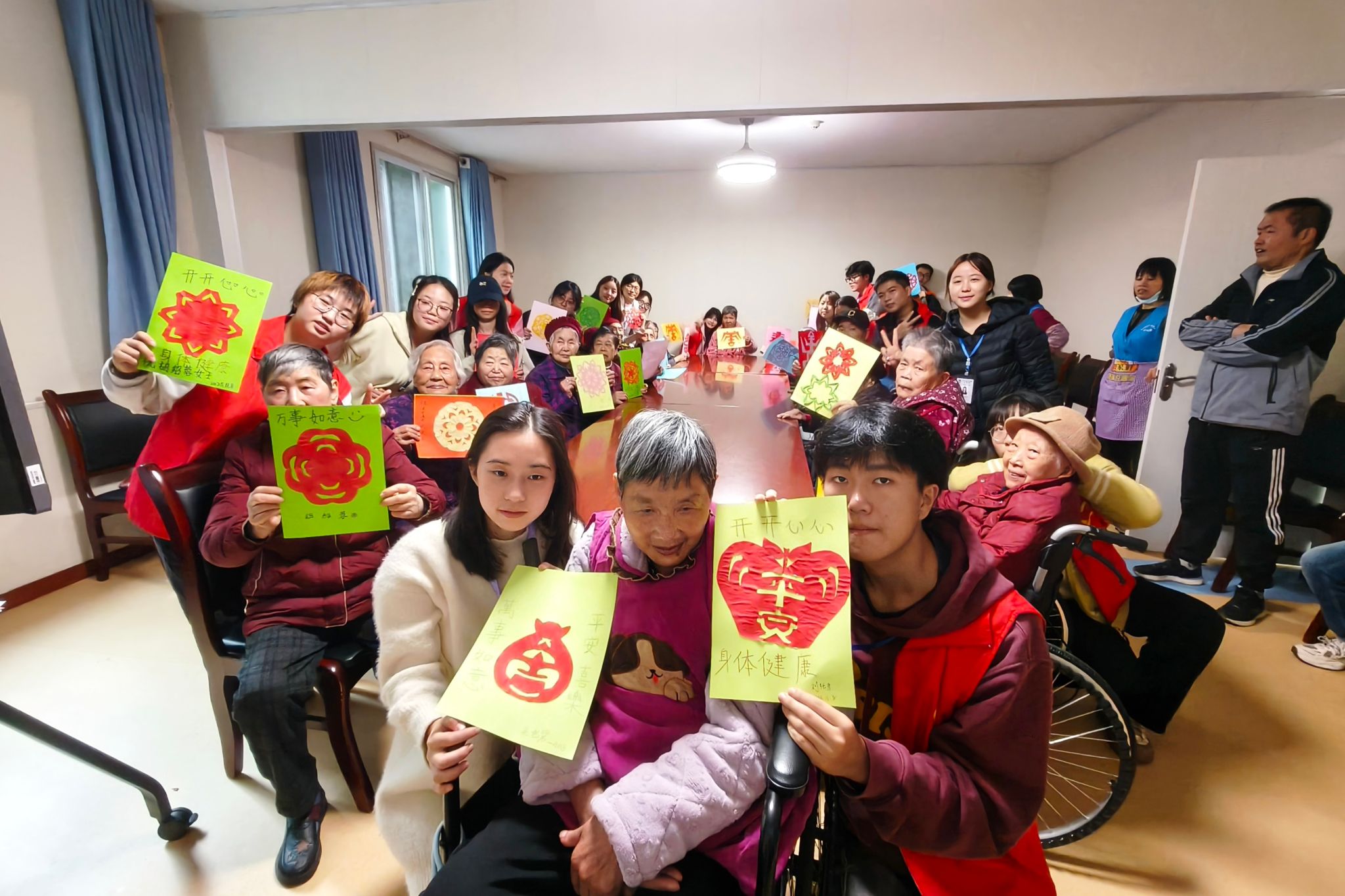 活动伊始,志愿者们分组入户,热情邀请老人们前往活动室参加活动。在精心布置的活动室内,志愿者陪伴在老人身旁,细致讲解剪纸的基本技巧与步骤,并亲自示范、耐心指导。彩纸在指尖翻转,剪刀轻盈游走,不一会儿,寓意吉祥的窗花、栩栩如生的生肖等图案便逐渐成型。现场气氛温馨,部分擅长手工的老人更是兴致勃勃地主动创作,剪出了复杂精美的图案,赢得了大家的阵阵赞叹。接着,志愿者们和老人们把剪好的图案贴在卡纸上并写下祝福语。最后,老人们手持剪纸作品和志愿者们合照,将这份温暖定格。