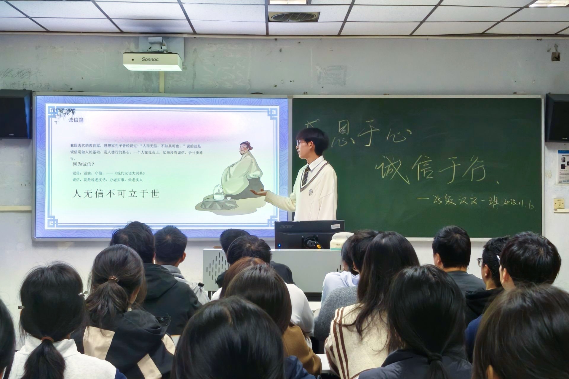 辅导员围绕“感恩”与“诚信”两大主题展开讲解。在感恩篇中,辅导员从感恩父母的血脉养育、无私守护,到感恩教师的传道授业、润物无声,再到引导学生珍惜当下生活、摒弃抱怨心态,通过具象化的场景与情感共鸣,让学生深刻领会感恩的本质内涵;在诚信篇中,辅导员引用“人而无信,不知其可也”等经典论述,追溯诚信的文化根源,又结合明星诚信危机、学生贷款拖欠、考试舞弊等现实案例,剖析失信的危害,阐释诚信在个人成长、社会交往中的重要价值。最后,辅导员向全体同学发出倡议,呼吁大家常怀感恩之心,笃行诚信之举,将美德内化于心、外化于行。