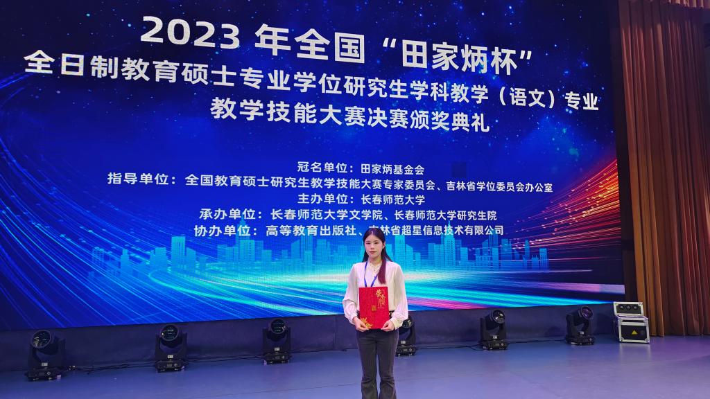操千曲而后晓声,观千剑而后识器。学习学科教学(语文)专业的她深知只有不断磨练师范技能,才能打牢教育教学的基础。于是便日复一日地熟悉中学教材,解读语文课标,精心打磨教案,学习前辈经验,模拟课堂教学,一步一步,稳扎稳打。研一参加全国“田家炳杯”教学技能大赛。作为太阳成集团唯一晋级国赛的选手,与来自全国师范院校的杰出选手展开激烈角逐,内心深感责任重大,焦虑、脱发、多听、多看、多写,一次次补缺删改,一次次推倒重来,在夜深的操场无声落泪,在沉静的夜晚孤独敲击键盘。上天不会辜负每一个努力奔跑、追逐梦想的人,最终,在第九届“田家炳杯”全国师范院校师范生技能竞赛中荣获二等奖。
