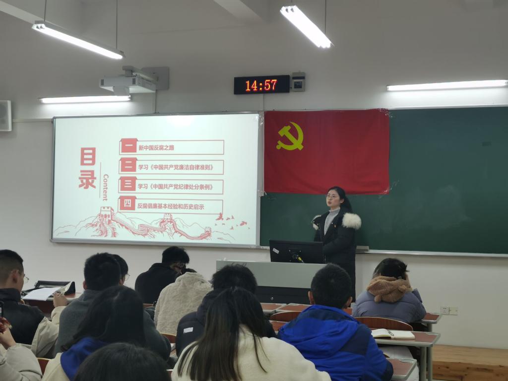 为深入贯彻落实党风廉政建设工作精神,加强党内法规学习,强化党员同志的纪律和规矩意识,我院于12月23日在博学楼2栋405开展党风廉政建设宣传教育活动,学生第三党支书记王陈超同志主讲,全体党员同志参与学习。