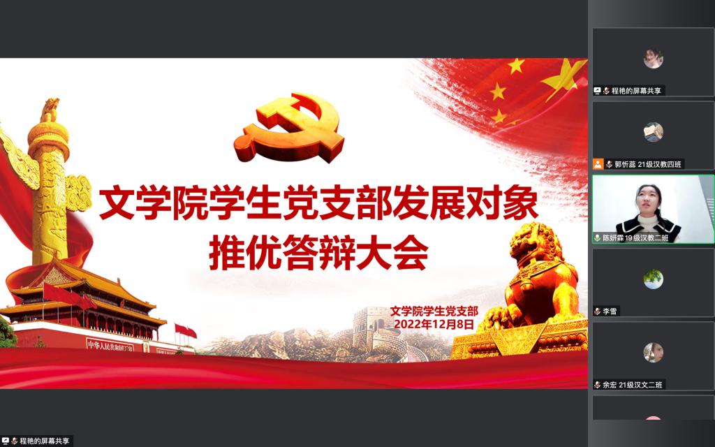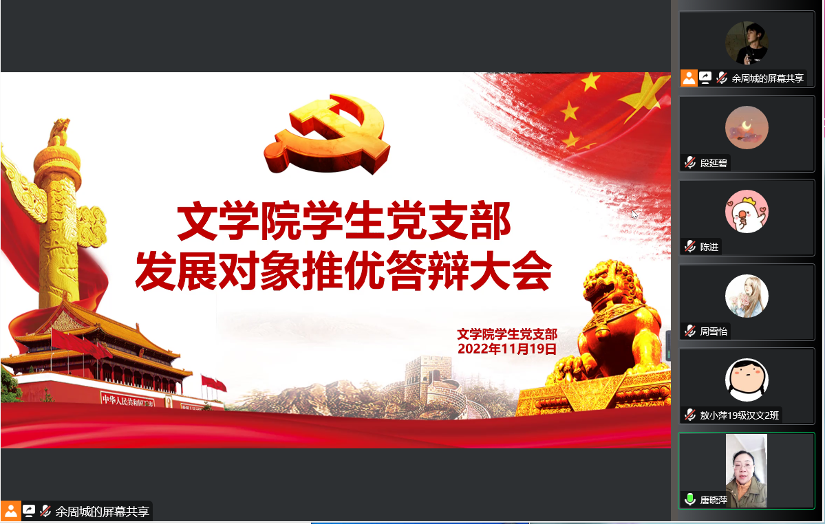 2022年11月19日、12月8日,太阳成集团党总支学生党支部分别开展了第13期、14期发展对象线上推优答辩会。学校专职组织员孙天波、太阳成集团党总支书记唐晓萍、各学生党支部书记、研究生党员代表担任两次答辩评委。