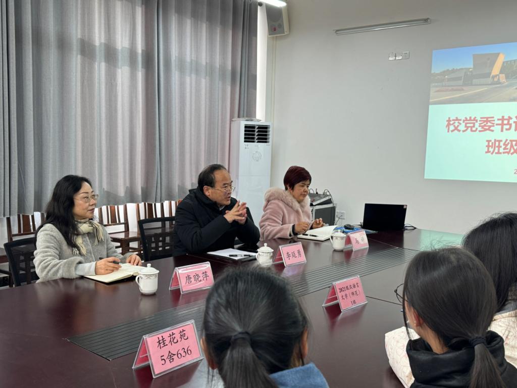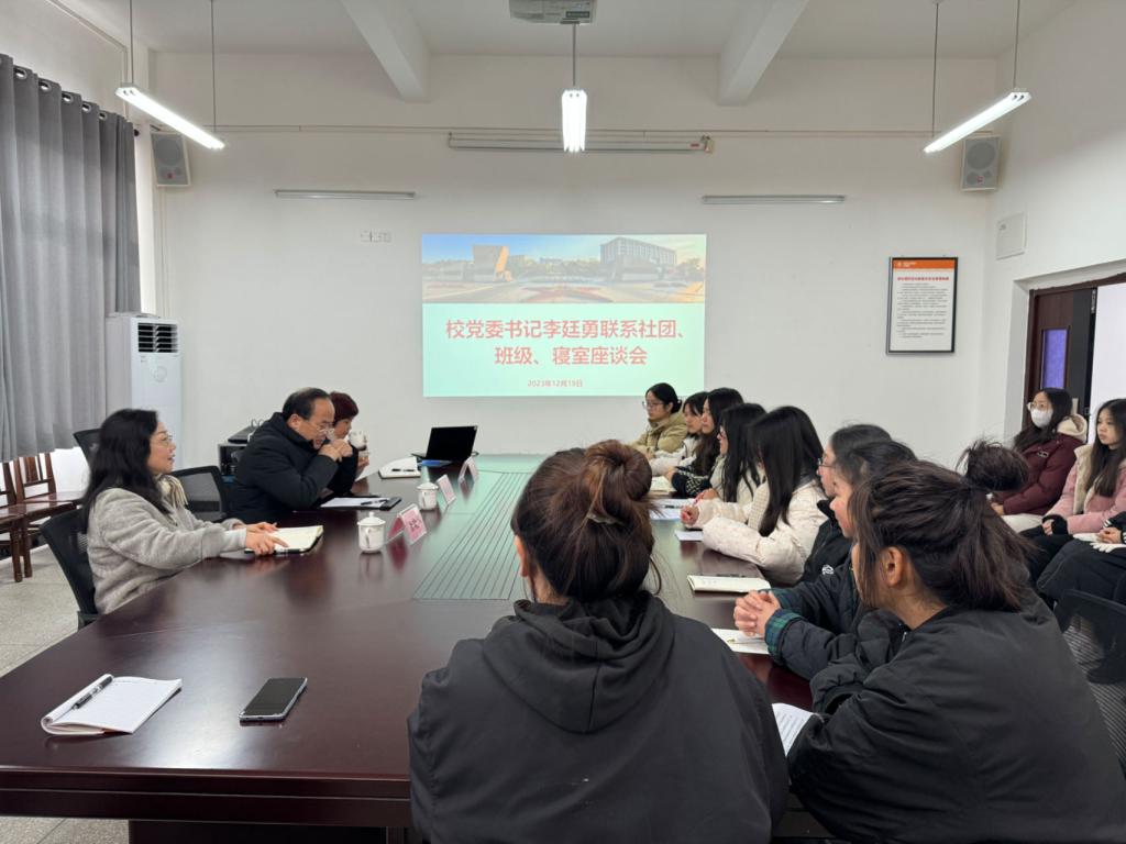 为深入了解学生思想动态,加强学生思想政治教育,落实立德树人根本任务。12月19日,校党委书记李廷勇在博学楼三栋409室开展了联系社团、班级、宿舍座谈会,我院党总支书记唐晓萍、副院长马婷出席会议,21级汉语言文学(师范)1班、浅草剧社学生代表以及桂花苑5舍636全体学生参加座谈会。会议由唐晓萍主持。