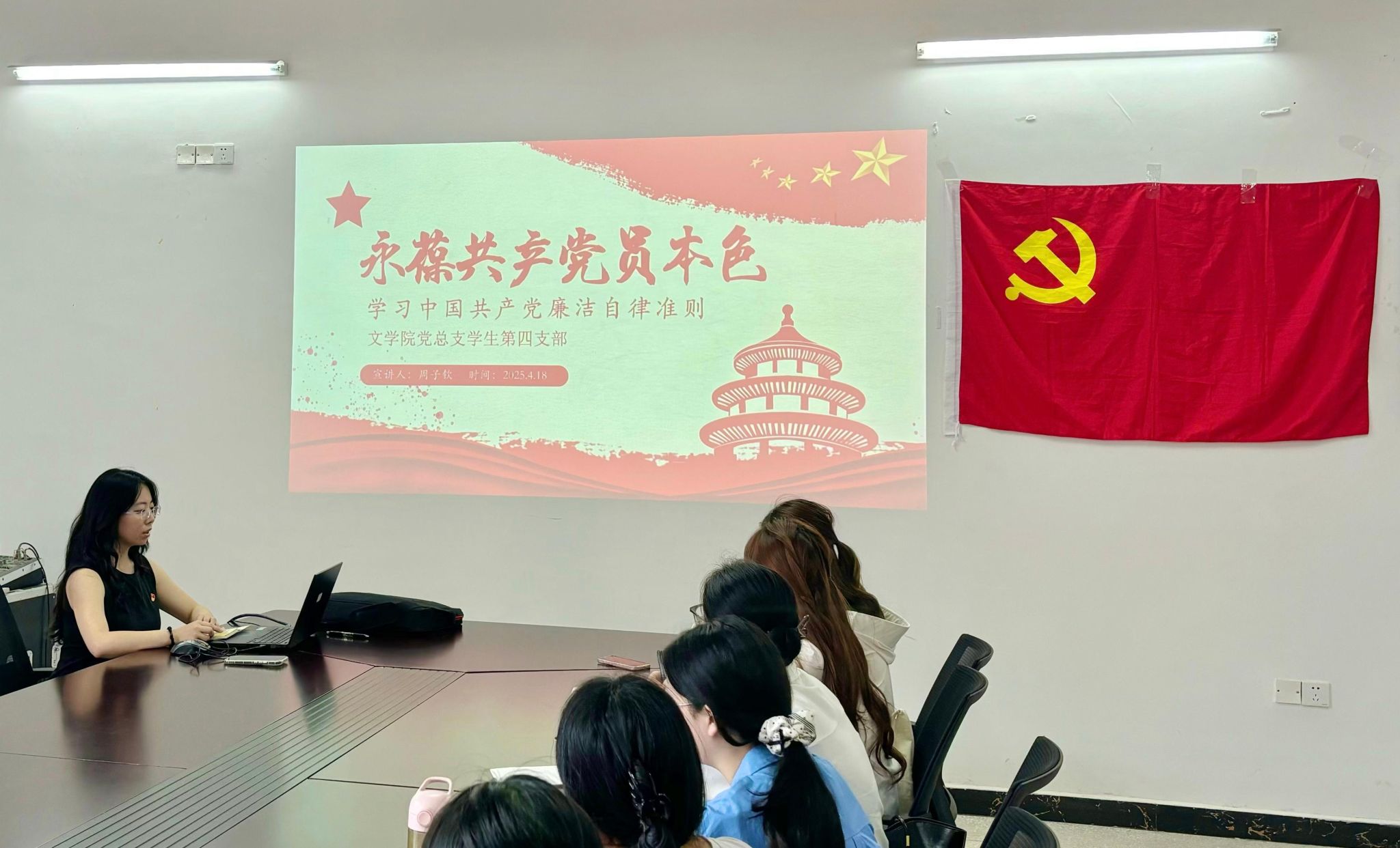 为深入学习贯彻中央八项规定精神,强化党员纪律意识,筑牢廉洁思想防线。2025年4月18日,太阳成集团tyc539学生第四党支部书记周子钦主持召开专题学习会,集中学习《中国共产党廉洁自律准则》,党支部在校党员参加了本次活动。