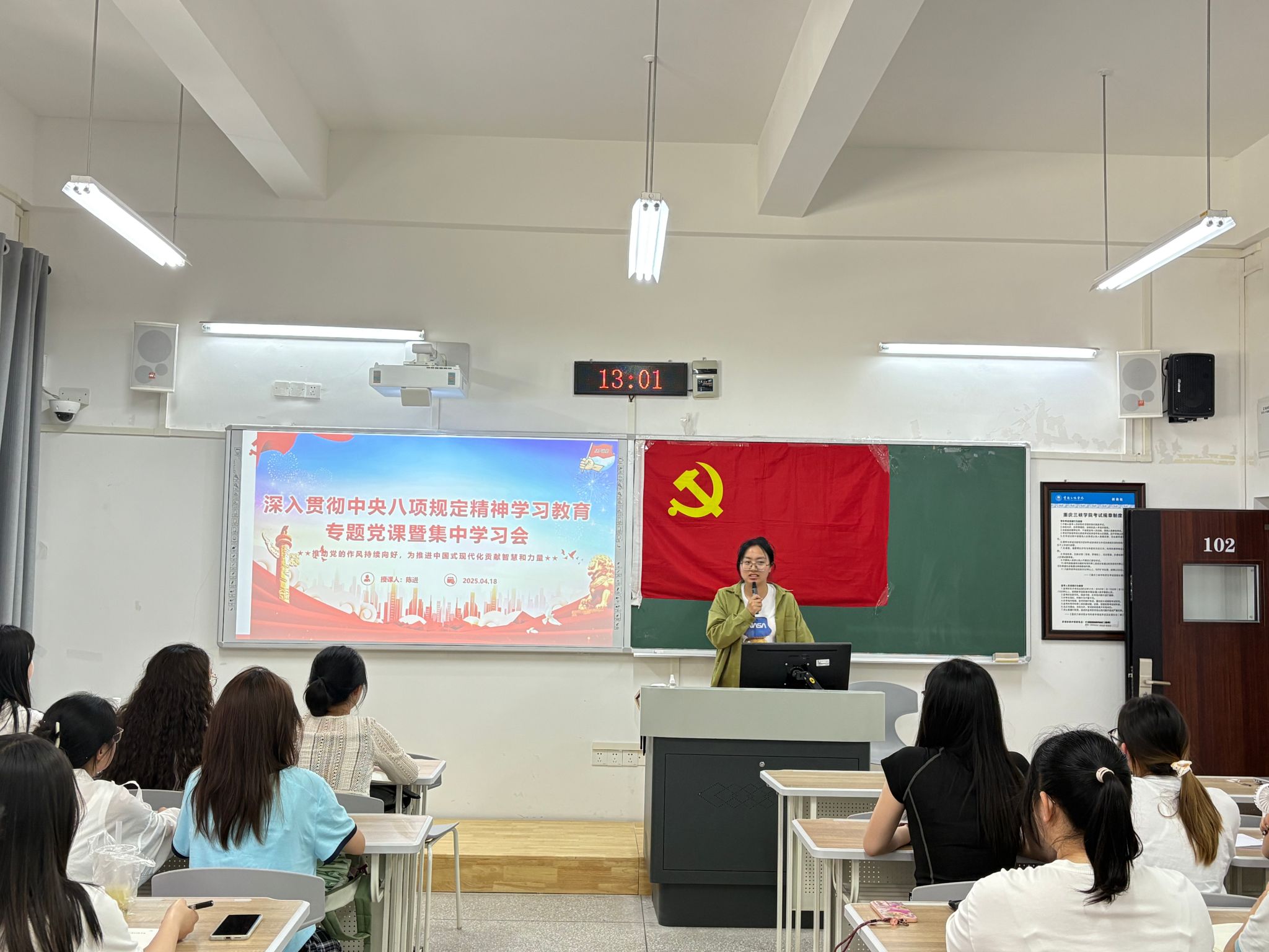4月18日,我院党总支学生第二党支部在博学楼1栋102室组织开展了深入贯彻中央八项规定精神学习教育专题党课暨集中学习会。本次党课由党支部书记陈进主讲,支部在校党员参与,第86期积极分子、第19期发展对象列席学习。